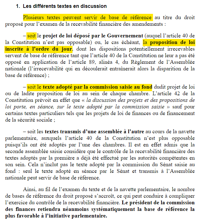 Réponse : la jurisprudence, constante, est de prendre la base la + favorable à l’initiative parlementaire. C’est pas moi qui le dis, c’est Eric Woerth dans son rapport en tant que président de la commission des finances sur l’application de l’article 40 (qui est le mode d'emploi)