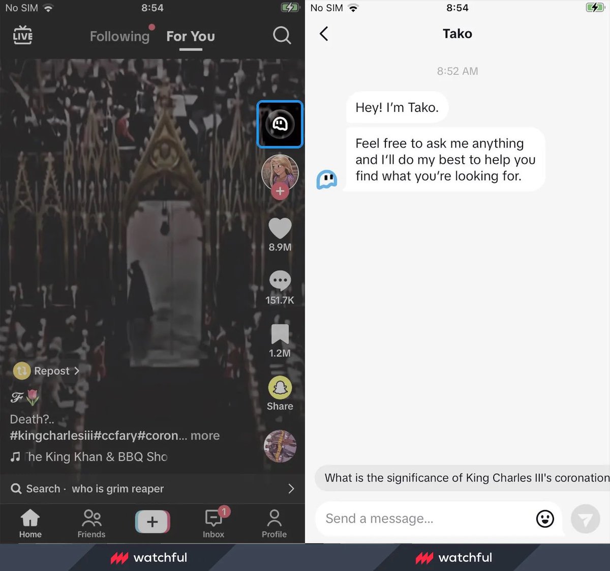 Tako appears on the right-hand side of the TikTok interface, allowing users to ask questions.