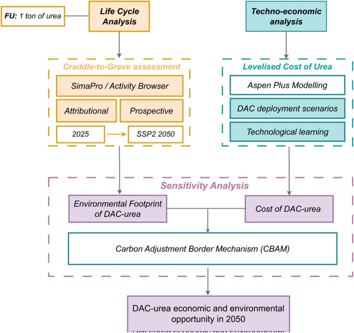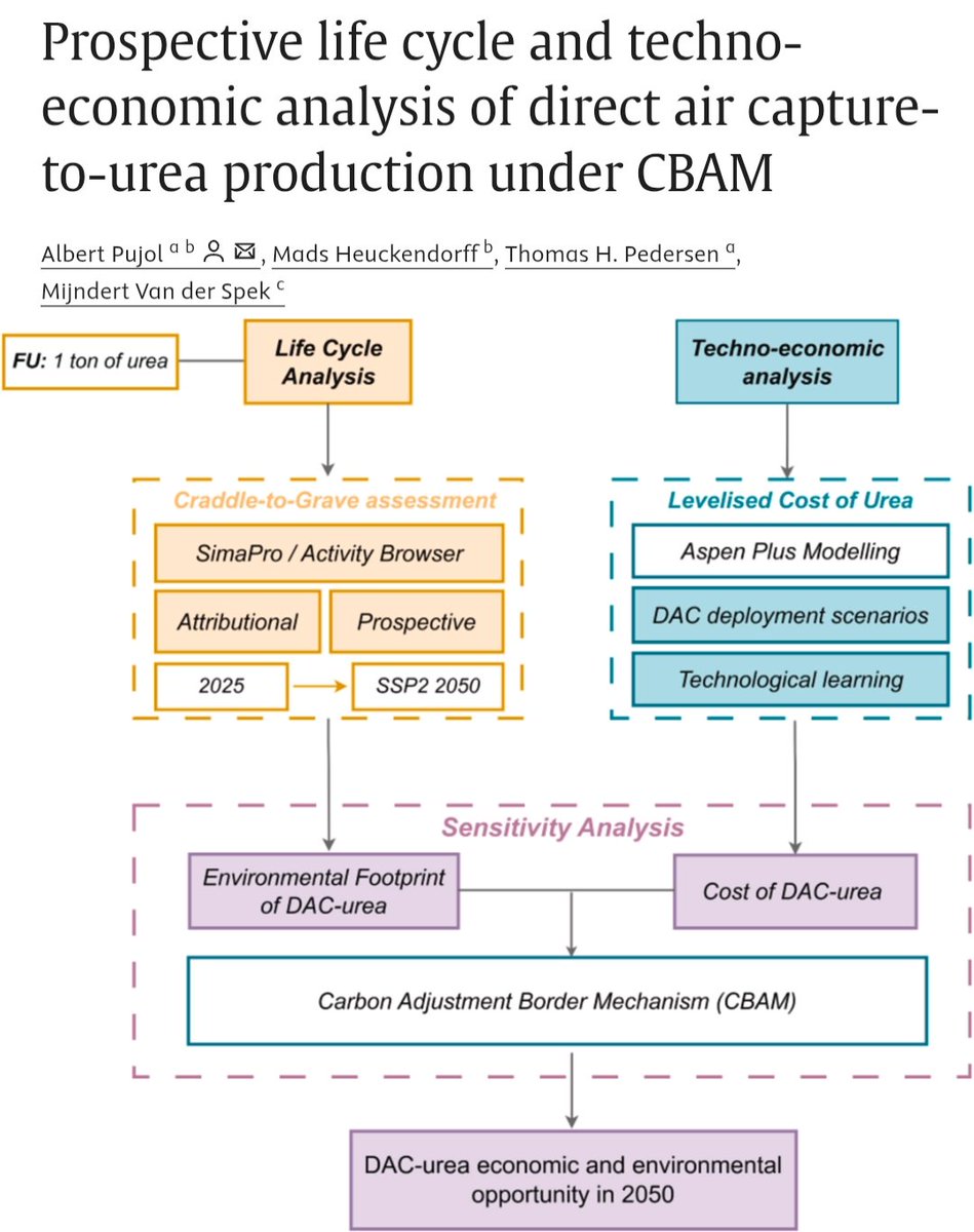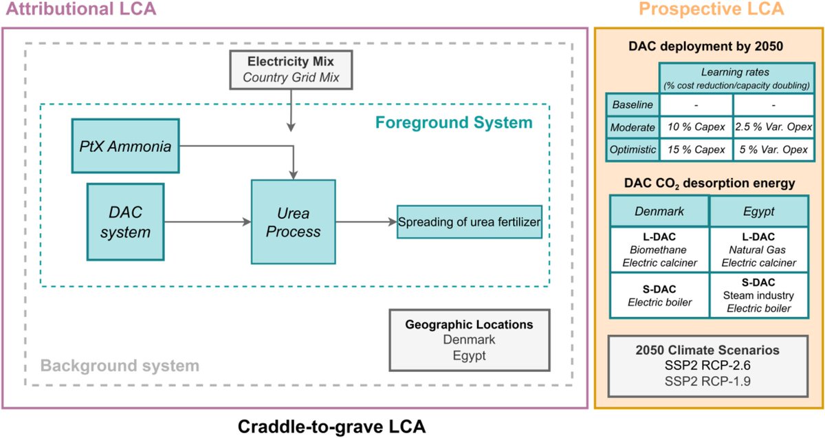 3/Study presents a framework combining process modelling, prospective LCA & TEA to compare DAC-urea with conventional fossil-based urea today & under 2050 climate scenarios, including a cross-country assessment of Denmark’s clean electricity system & Egypt’s more C-intensive grid