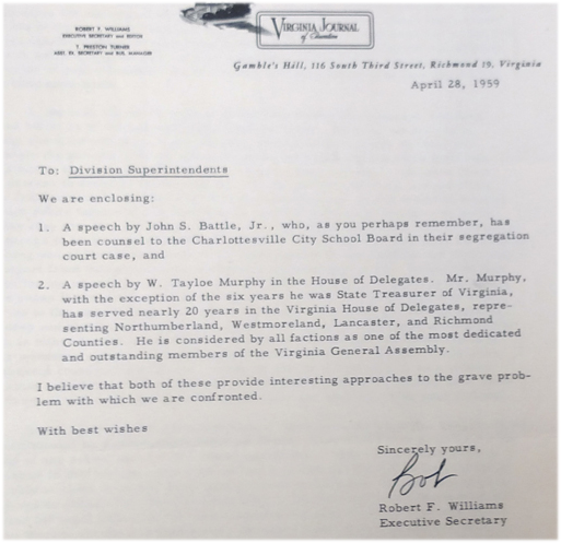 For reference, here is a 1959 memo by the head of the Virginia Education Association teachers' union promoting a plan by John S. Battle, Jr. to address the "grave problem" of court-ordered school desegregation.