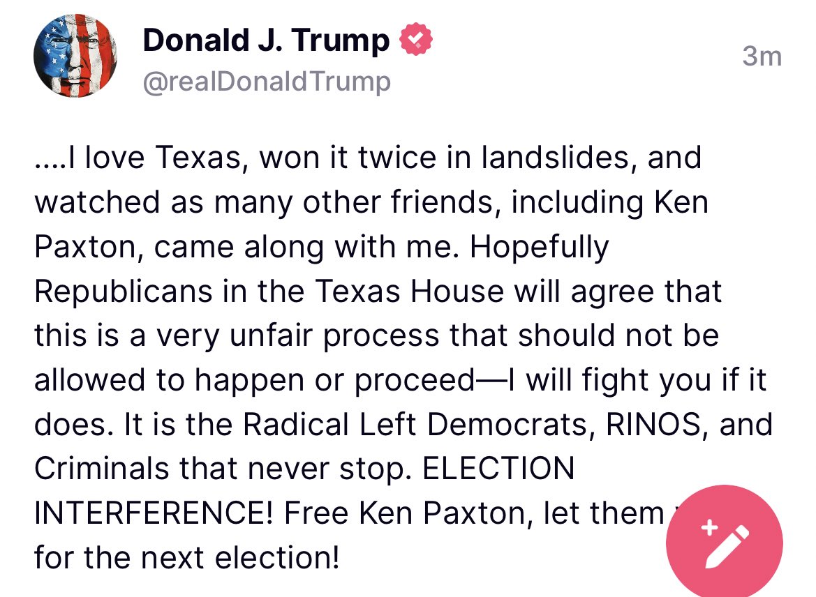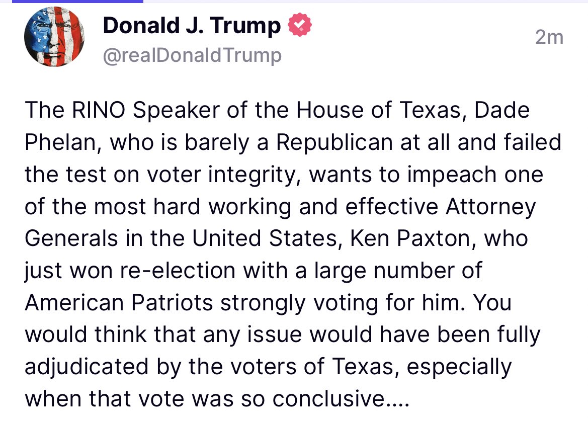 Paxton says other statewide leaders are fed up with Phelan, he's just the first to speak out. "I have nothing personal against Dade," but "the results have not been good. The Senate delivers, the House does everything they can to slow things down." #txlege