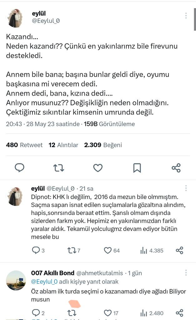 10 yıldır Erdoğan'ın karşısındakini destekleyip hüsran yaşayan fetö'cüler, son seçimde de Erdoğan'a oy veren anne babalarına lanet yağdırıyor. Tarihin en kahpe örgütüne üye olup masum olduklarını düşünüyorlar? Beyin gidik!