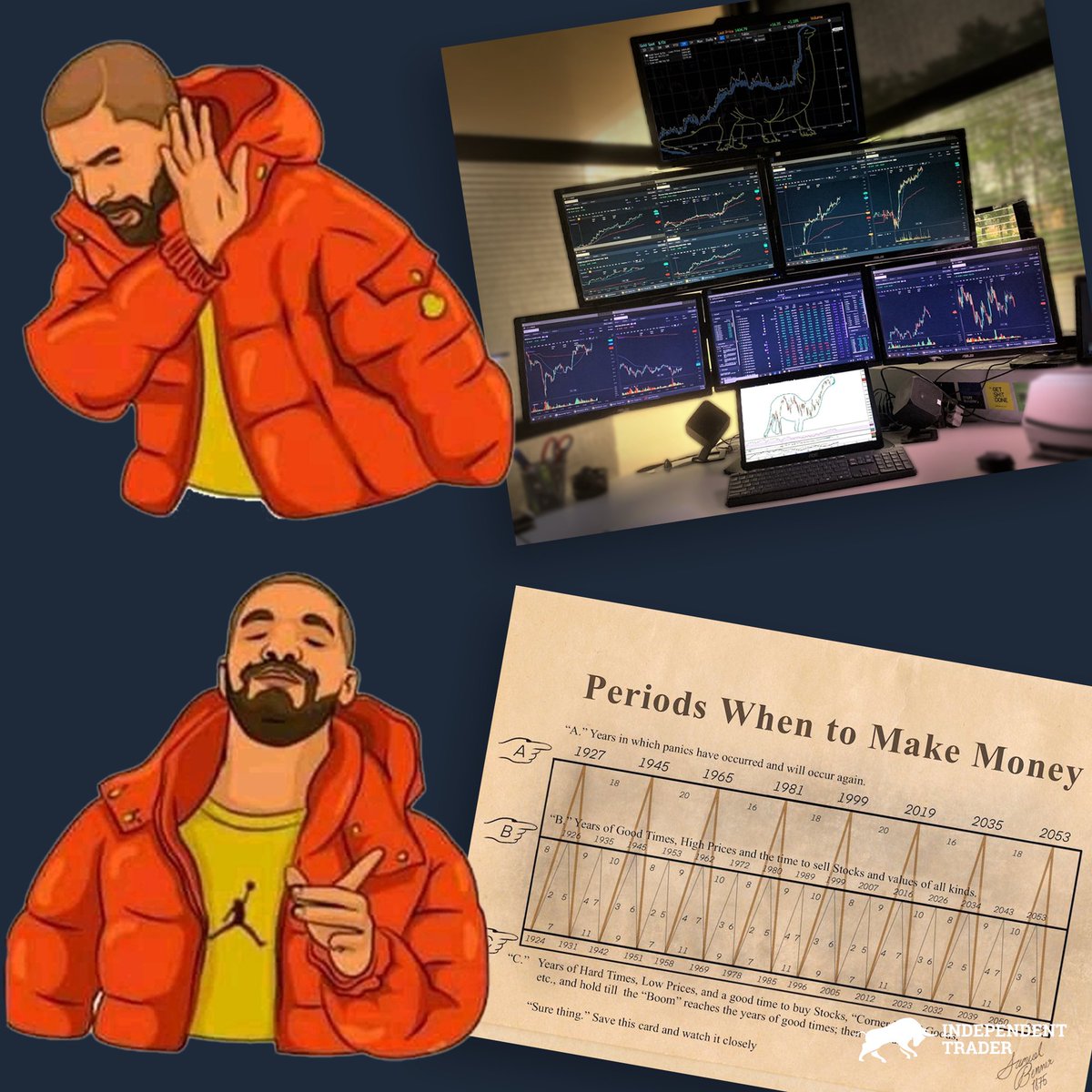 Linia A prezentuje lata paniki na rynkach, które powtarzają się co 18, 20 i 16 lat, a te składają się w większy cykl występujący co 54 lata. Linia B to lata dobrych czasów i wysokich cen naprzemiennie powtarzających się co 8, 9 i 10 lat.