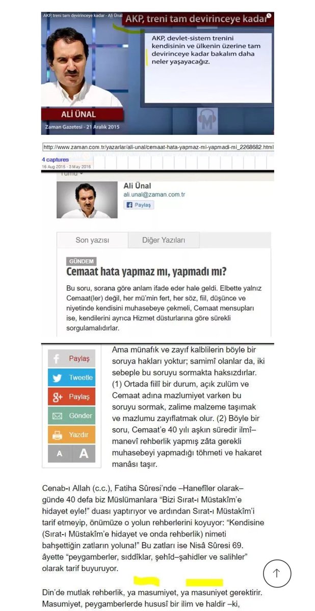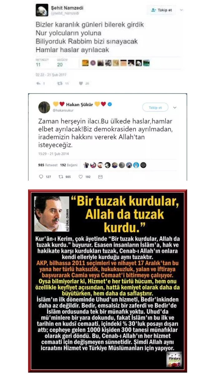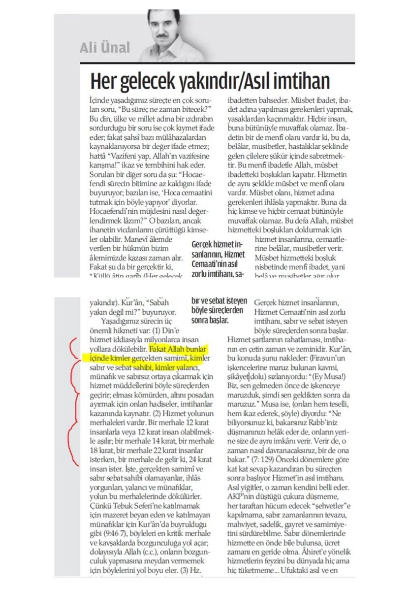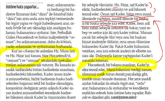 eski Şii “dâî”si Ali Ünal ve Abdullah Aymaz’ın (İsmail Yediler, E. Abdurrahman) defalarca yazdığı gibi Gülen, mânâ yani bâtın âleminde hükmü veriyor, zâhirde yani şu görünen âlemde de birileri onu fiiliyata geçiriyor. Örgütün çektiği sıkıntıların takdir edicisi de Gülen! Çünkü