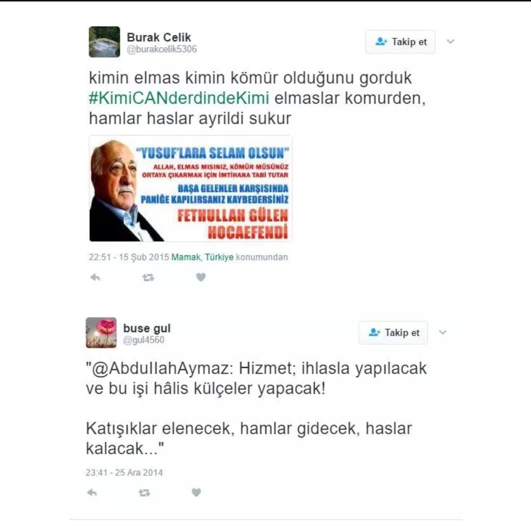 değil. Büyük çoğunluğu Bylock kullanmasına, çalıntı sorularla okullara ve işlere girip, özellikle tüm mahrem süreçleri “bizzat” bilmelerine rağmen yüzleri kızarmadan “Bizim darbeyle ne ilgimiz var ki!” diyebiliyorlar.