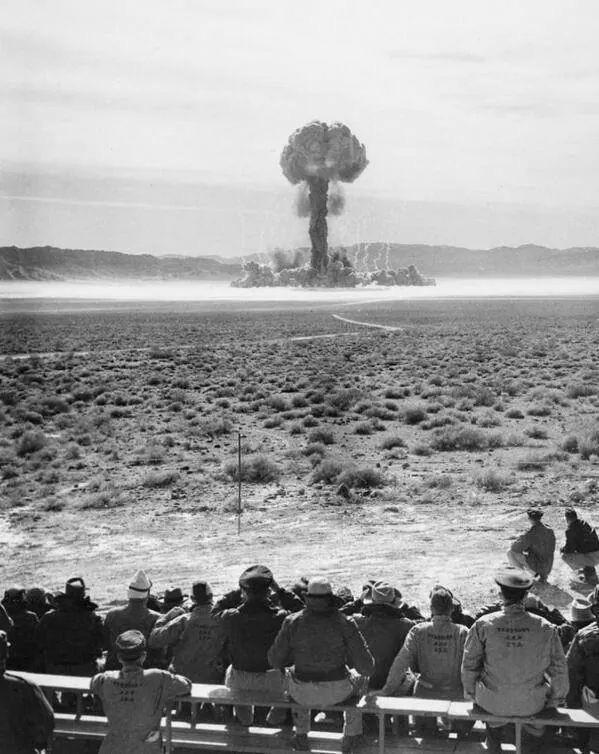 - Personas viendo una prueba de bomba atómica en Nevada, 1950.