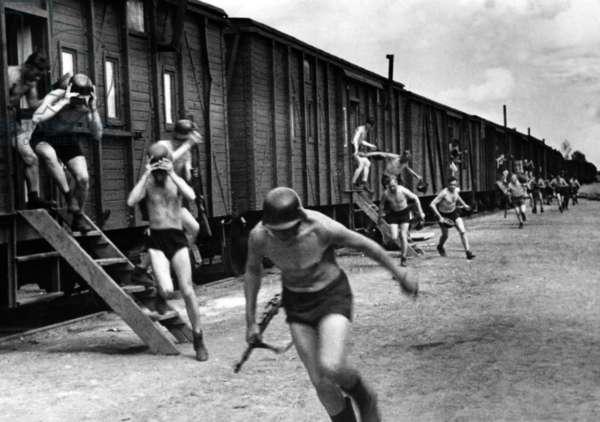 - El equipo operativo de una batería antiaérea ferroviaria alemana corre hacia los cañones después de ser sorprendidos por los enemigos. 1943.