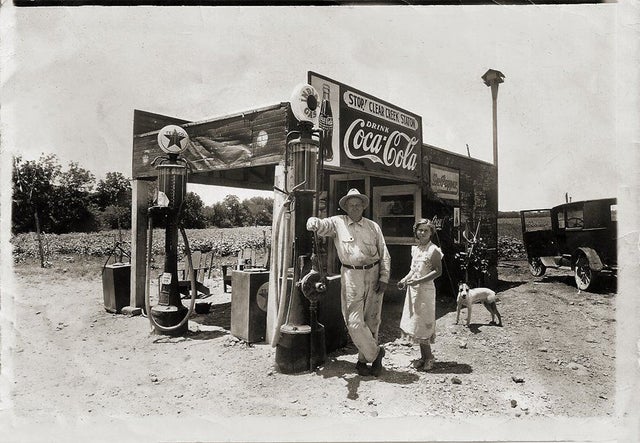 - Una estación de servicios en Texas a principios de la década de 1940.
