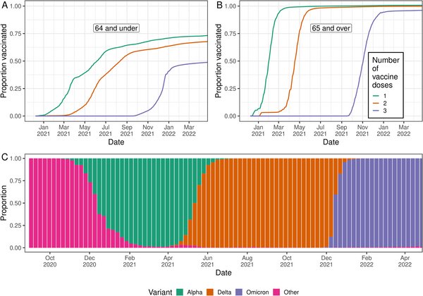 Vaccination coverage and variants responsible for infections in England, as inferred from public data sets.
