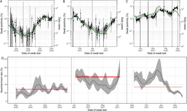3) A comparison of daily cases to swab positivity as measured by REACT-1.