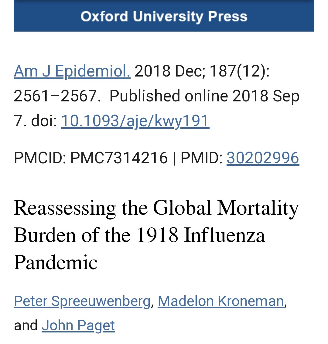 3) It is the same with 1918 influenza pandemic where we continue to see ridiculous estimates between 50 and 100 million deaths. The only real recent and serious study shows that this number was around 18 million dead. ncbi.nlm.nih.gov/pmc/articles/P…