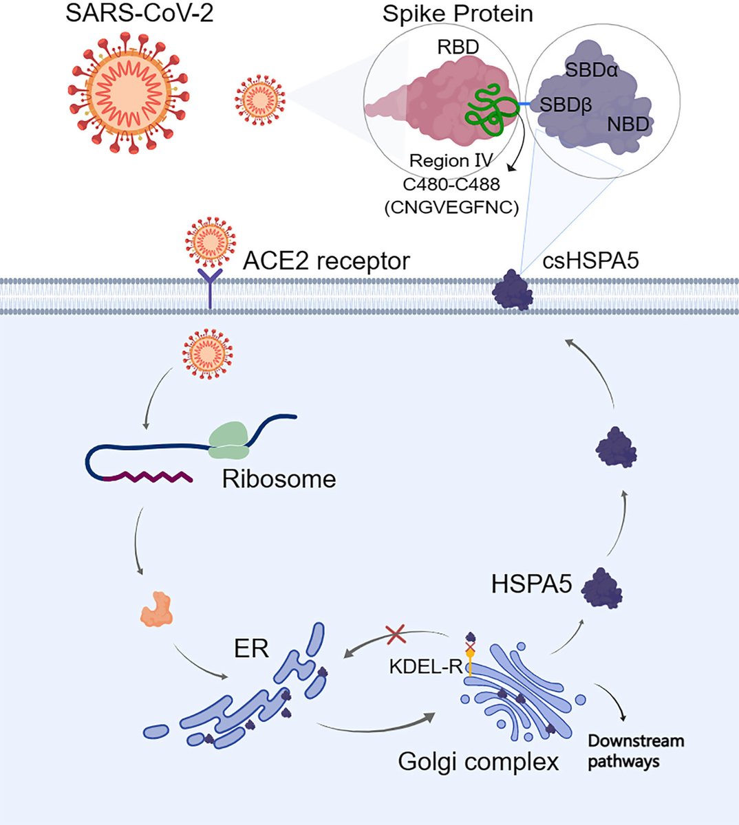 3) Fig. When the endoplasmic reticulum is stressed, HSPA5 is translocated to the cell surface and subsequently bound to the region IV (C480-C488) in the spike protein (S-protein) of SARS-CoV-2, thus acted as a receptor/entry protein for virus entry.