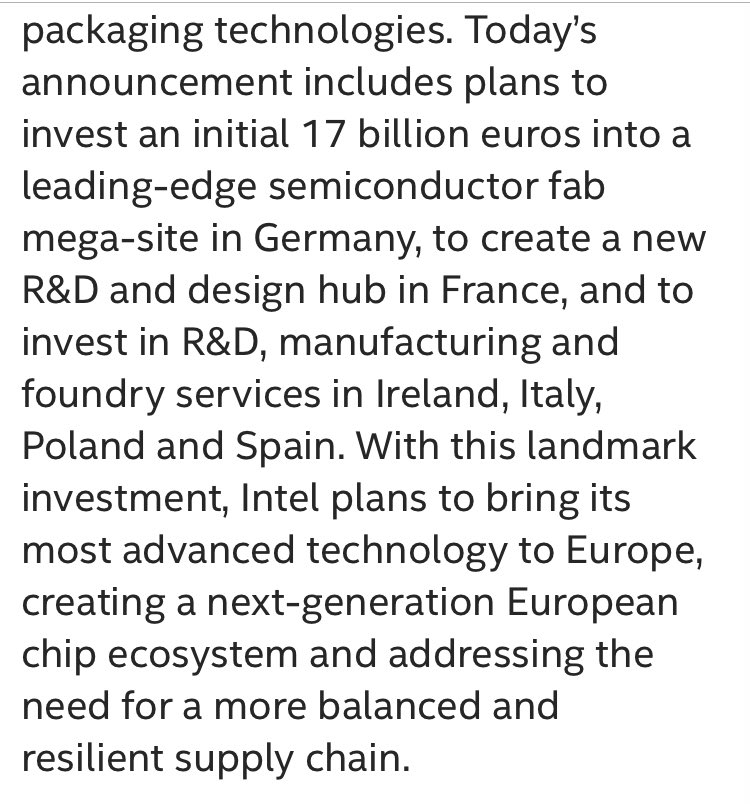 Reminder: Intel plans to invest up to 80 billion euros in the EU in the next decade, and have already committed 17 billion euro.