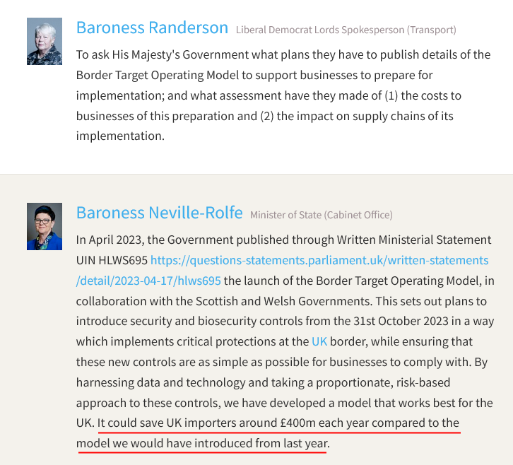 Now, the Tories are boasting about a saving of £400 million a year from the new border operating model coming later in 2023.