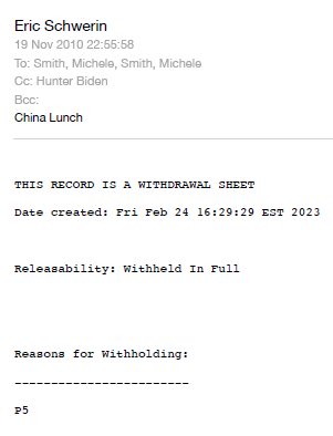 /6 As reported by @nytimes, BHR Partners was the investment firm Hunter co-founded with CCP-backed investors. The National Archives redacted the email because its “Release would disclose confidential advice between the President and his advisors, or between such advisors.”