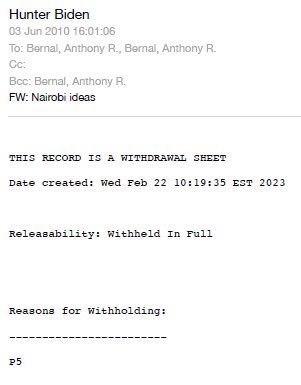/10 Sometime after the call, Hunter emailed Jill Biden’s advisor, Anthony Bernal, about “Nairobi ideas,” and the National Archives redacted it entirely because its “Release would disclose confidential advice between the President and his advisors, or between such advisors.”
