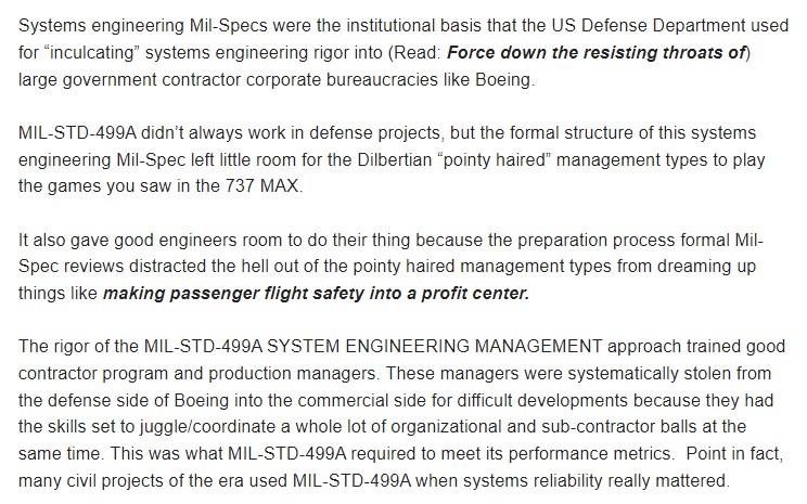 Back in 2019 I wrote about the political/institutional history of MIL-STD-499A in relation to Boeing's 737-Max engineering debacle on the Chicagoboyz weblog.