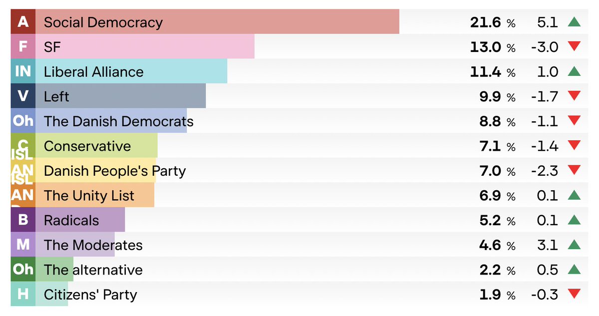 2/ Denmark's political system is highly fragmented but is divided between a 'red bloc' of left and centre-left parties and a 'blue bloc' of centre-right to far-right parties. A poll carried out for national broadcaster DR shows the latter sustaining a major loss of support.