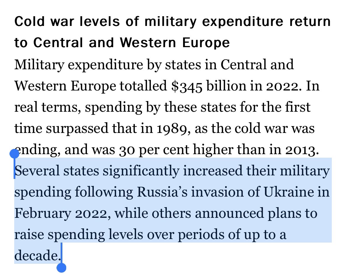 Ma questo Tarquinio non lo dice. È vero anche che ora l’Europa spende di più rispetto “alla vigilia della caduta del Muro di Berlino”. Ma la causa, scrive SIPRI, è sempre l’invasione russa dell’Ucraina, che ha indotto molti paesi europei a investire più risorse sulla difesa. 3/n