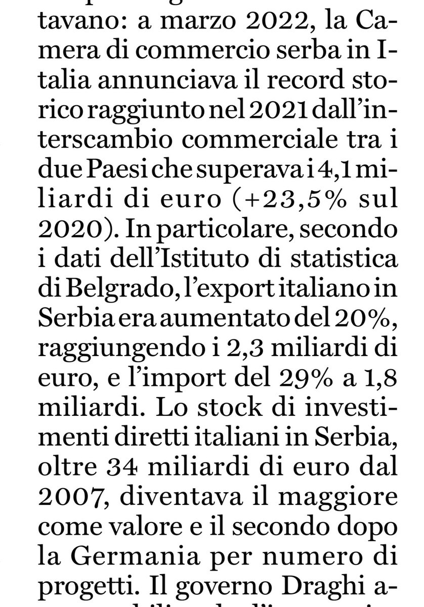 Orsini fa reggere tutto il suo ragionamento su questi numeri: nel 2021 l’interscambio con la Serbia superava i 4,1 miliardi (+23,5% rispetto al 2020); lo stock di investimenti diretti italiani in Serbia è di oltre 34 miliardi di euro dal 2007. Ma che significano questi dati? 3/n
