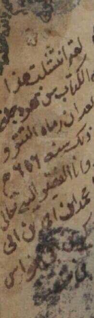 It reads in the margin of al-Rāghib al-Iṣfahānī’s al-Mufradāt fī Gharīb al-Qurʾān "I retrieved this book from the Tigris River after it was thrown by the Tatars in the year 656 AH." written by Muhammad ibn Ahmad, the slave in need of Allah."