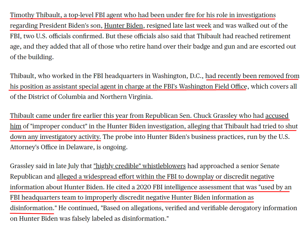 "Timothy Thibault, a top-level FBI agent who had been under fire for his role in investigations regarding President Biden's son, Hunter Biden, resigned late last week..."