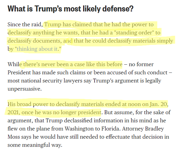 'Trump has claimed that he had the power to declassify anything he wants, that he had a "standing order" to declassify documents, and that he could declassify materials simply by "thinking about it."