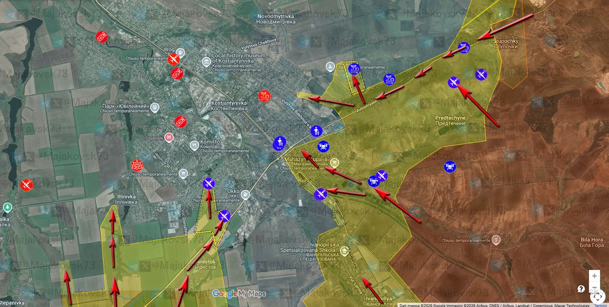 1\#Ucraina Fronte di Kostijantynivka: ampliate infiltrazioni nella parte sud della città nella zona a Nord di Berestove. Probabilmente immagini si riferiscono ad infiltrazioni avvenute qualche giorno fa, quando c'era ancora la nebbia e segnalate da vari report. Ampliata area d'infiltrazione si nella sezione Est e Sud-Est della città