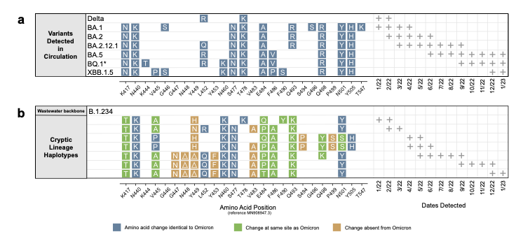 Cryptic lineages are distinct SARS-CoV-2 lineages that we detect in wastewater, but do not know their source. We believe they are from patients with very long COVID infections.