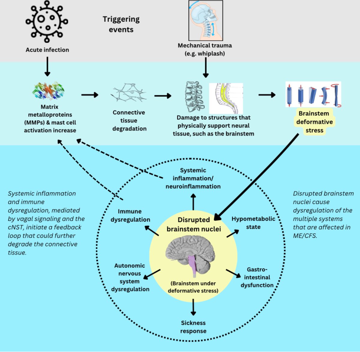 könnte eine nicht unerhebliche Anzahl von ME/CFS- und LC-Fällen eine „mechanische Grundlage“ haben. Die Hypothese: Ein auslösender Faktor, wie eine akute Infektion oder ein mechanisches Trauma, schädigt das Bindegewebe des Körpers und beeinträchtigt Strukturen, die die physische