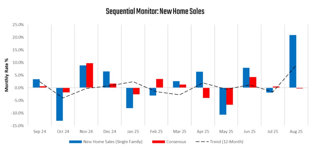 2/ New home sales surged +20.9% in August (vs –0.3% expected). Y/y single-family sales ~+3.2%. Big print; high volatility.