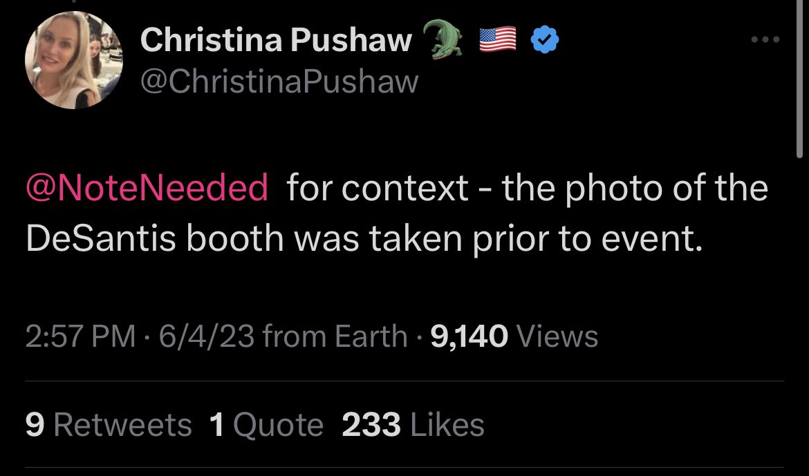 Here's how @ChristinaPushaw coordinates with @NoteNeeded: 1) Christina pings group about tweet 2) Group rates note from DeSantis author as good 3) Note placed on tweet