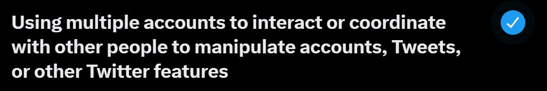 Note this is a violation of TOS under "using multiple accounts to interact or coordinate with other people to manipulate accounts, Tweets, or other Twitter features."
