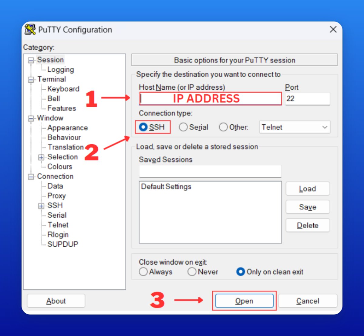 • Open PuTTY and paste the IP address into the "Host Name" field
