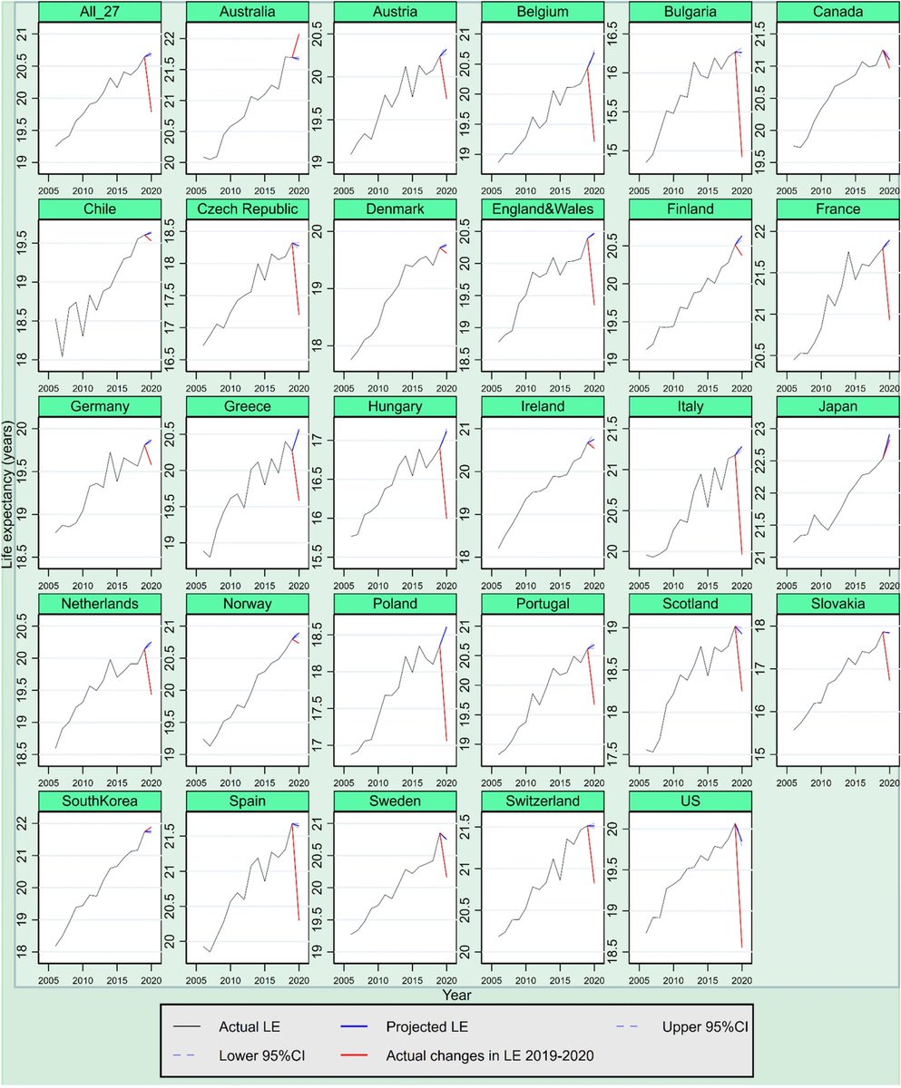 zeigen, dass die Lebenserwartung in 21 der 27 Länder im Jahr 2020 voraussichtlich gestiegen wäre, wenn COVID-19 nicht stattgefunden hätte. Unter Berücksichtigung der erwarteten Sterblichkeitsveränderungen zwischen 2019 und 2020 zeigt die Studie, dass der Verlust an