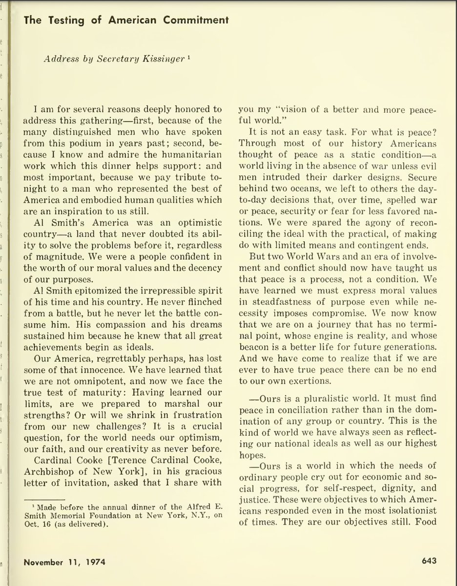 At the '74 dinner, Kissinger praised the foundation's "humanitarian work" and discussed a "vision of a better and more peaceful world."