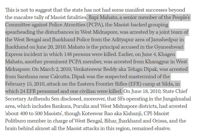 To her credit, Mamata Banerjee was able to manage the Maoist violence once she came to power. Dreaded Maoist leader Kishenji, who wanted Banerjee in power was later killed. Many PCAPA leaders have formally joined TMC and some of them like Suchitra Mahato got government job.