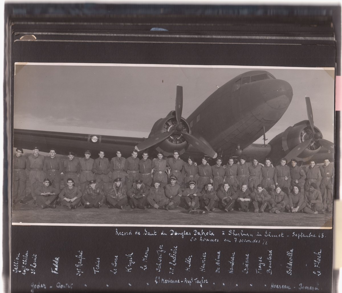 6/ In September 1943 Bouétard (pic, 5th from right, back-row) had been a member of the French SAS team that beat the US airborne record for the fastest stick exit from a Douglas Dakota – 20 men in 7 ½ seconds.