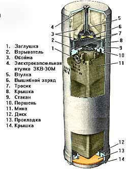 The PTM-3 mine is installed in a KPTM-3 cassette; after its release by a small charge, the cord is pulled releasing the mechanical safety