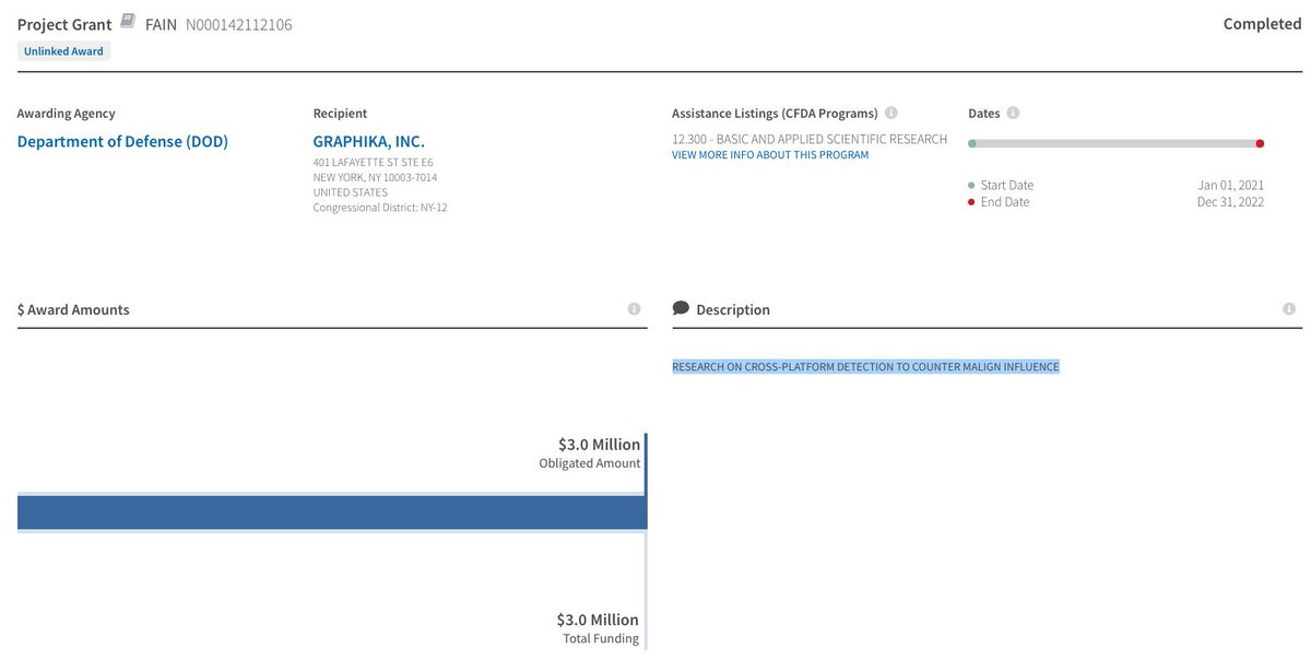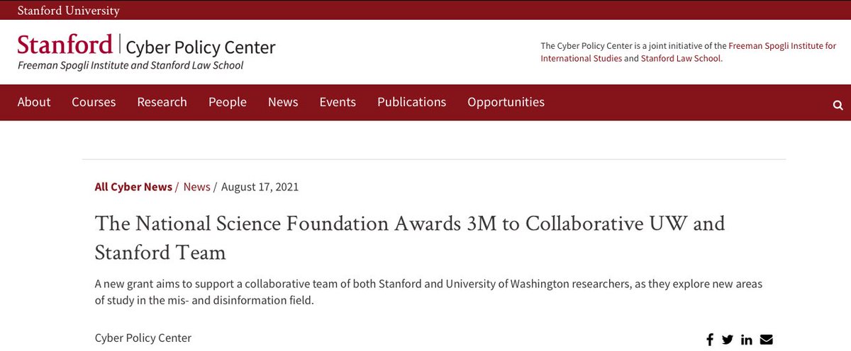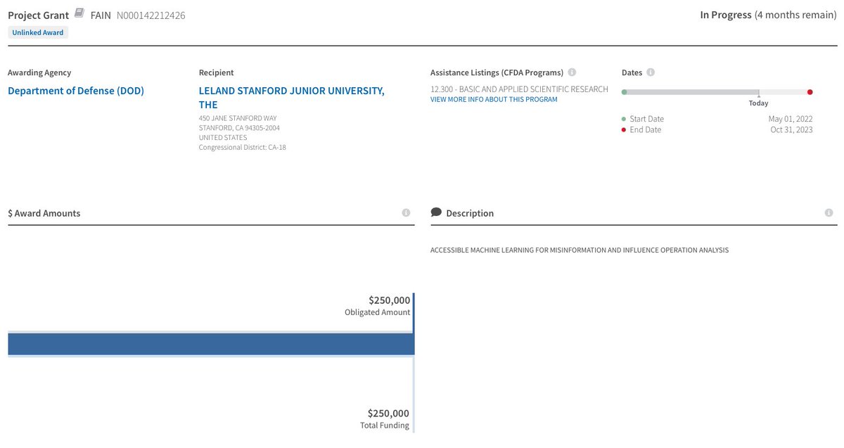 /11 Stanford received $3 million from the National Science Foundation and $250,000 from the DOD to study “Accessible machine learning for misinformation and influence operation analysis.”