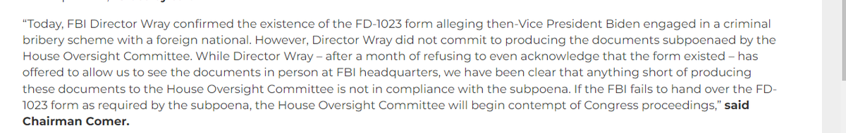 10/ This is huge now but will only get bigger because both Grassley and Comer have kept close to the vest what they have. They always had the June 30, 2020 FD-1023 & only revealed when FBI pretended form might not exist. We now know they also have 2017 FD-1023.