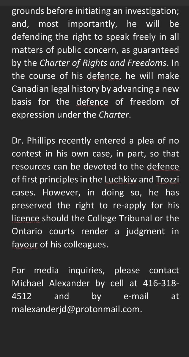 19/ With all that said, I do want to plug my lawyer Michael Alexander, and my fellow physicians Dr Trozzi and Dr Luchkiw who are continuing the legal fight for constitutional rights at the CPSO.