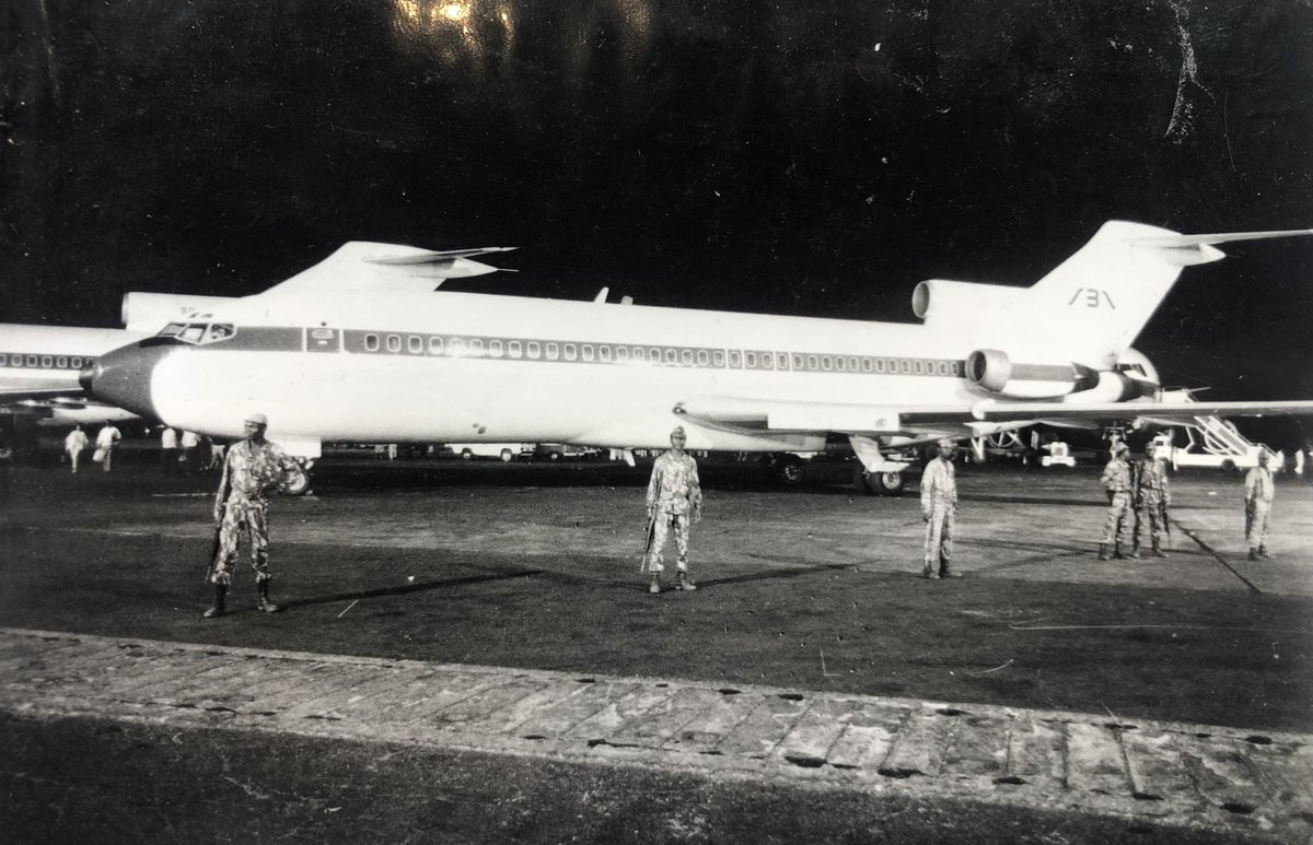 Konečně ve 2:40 nasedáme do vládního IL-62. Opět pod hlavněmi samopalů zairských vojáků. Ve 4 ráno přelétáme rovník. Necelou hodinu poté dostáváme jídlo. Je velmi dietní a dost nám připomíná Angolu. Šunka, rýže a žampiony.