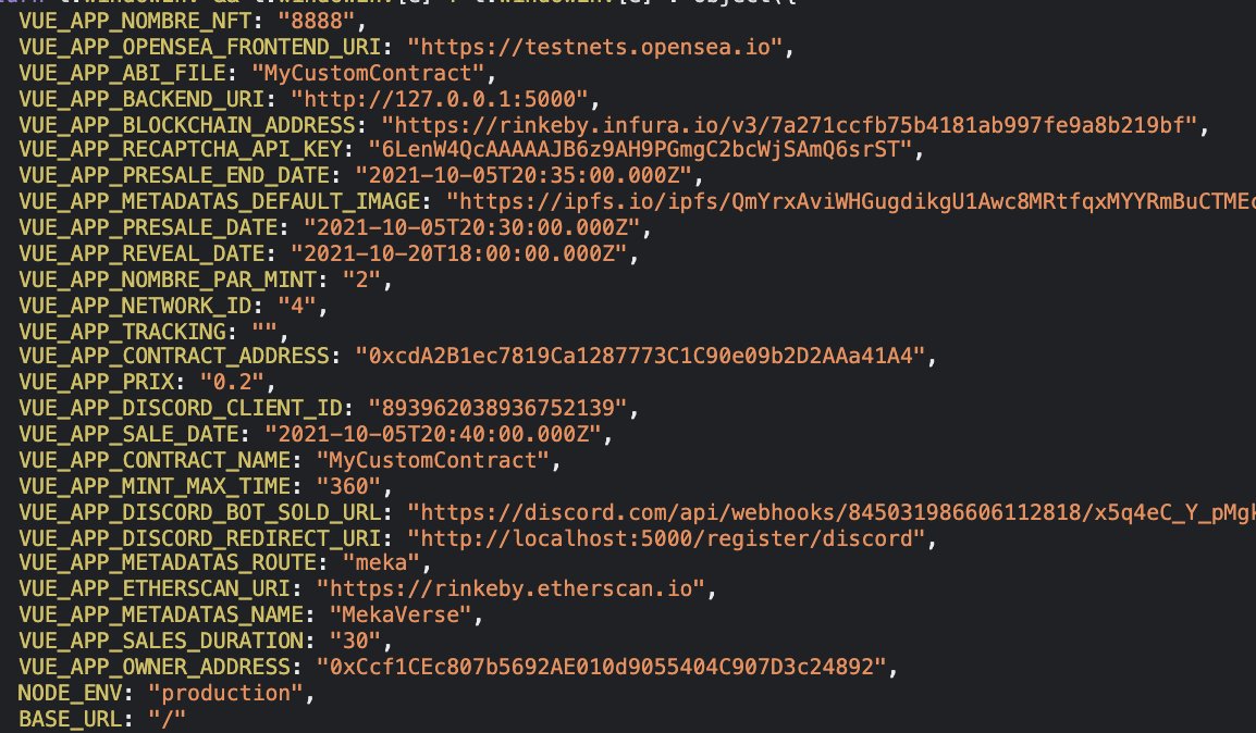 We since @MekaVerse's discord bot isnt verifiying ill place this here. The Vue app that runs their frontend is themekaverse.com and is dumping all the ENV vars to the frontend.