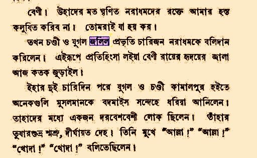 In view of the chaotic situation in society, Benimadhav decided to sharpen his sword to protect Dharma. He was a skilled swordsman and he used to offer bali of Pathans on every Amavasya night at the feet of his worshipped goddess, Maa Yavanamardini Kali.