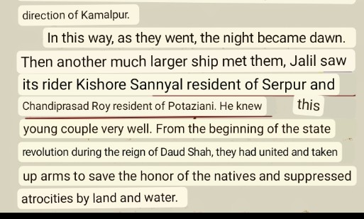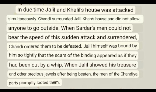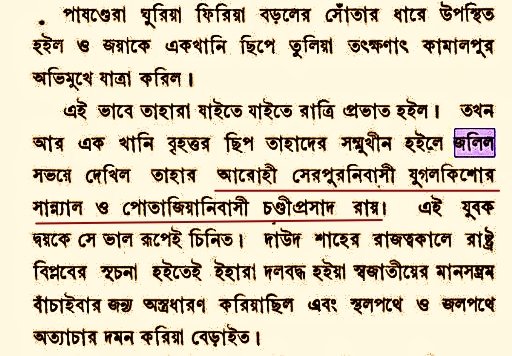 In due time receiving order of Beni Ray, Jugal & Chandi launched attack on Subedar Zalil Khan's house. Chandiprasad surrounded the entire house & Pathans surrendered in fear. Then Zalil Khan & Khalil Khan was tied & brought to Chalanbil, where they were sacrificed to Kali.