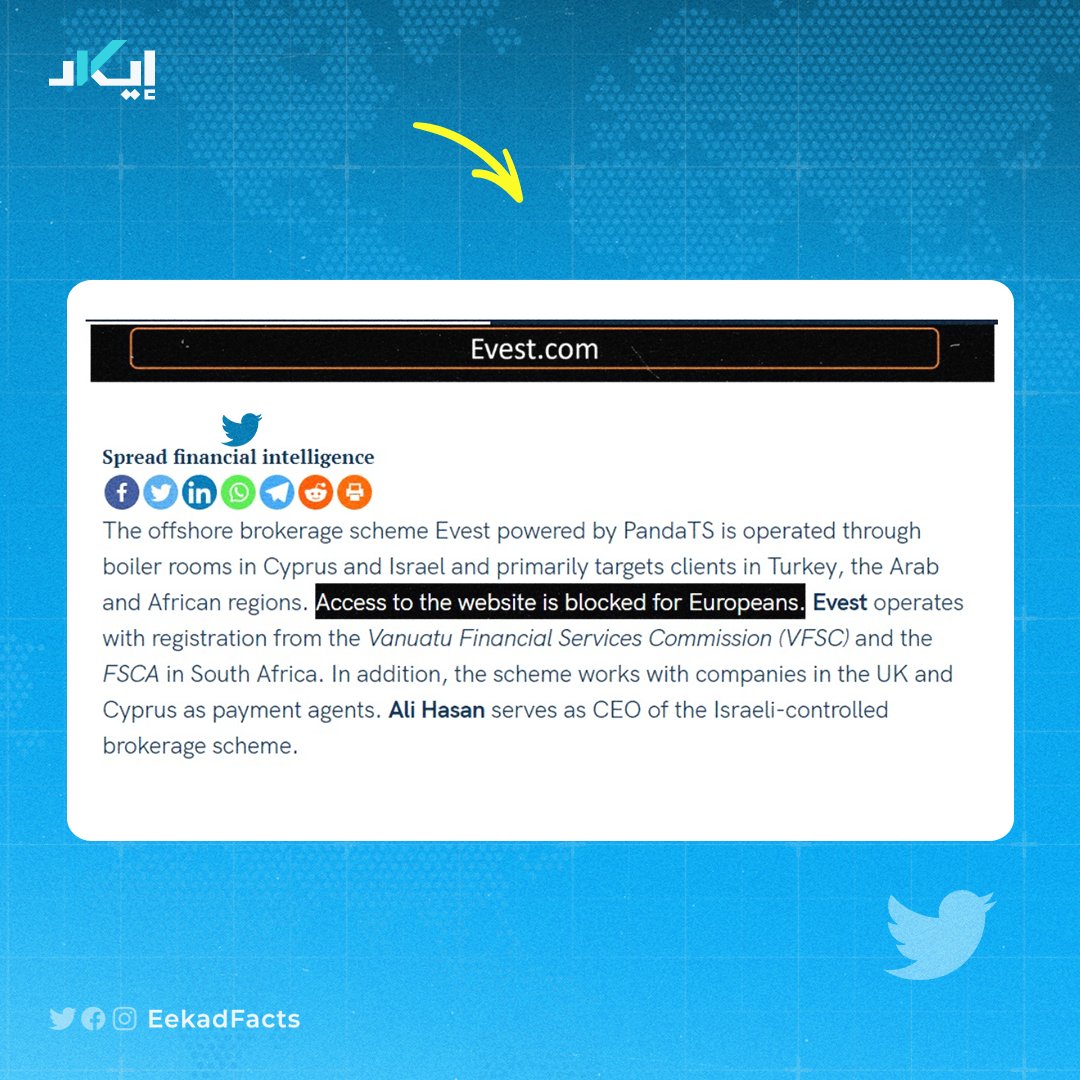 🔻 أضف لذلك أن صفحة منصة الاستثمار "Evest" تحذّر زائريها بأن خدماتها غير موجهة لسكان ومواطني أمريكا وكندا وروسيا وإسرائيل والاتحاد الأوروبي ودول أخرى، وذلك بسبب إيقاف خدماتها في دول الاتحاد الأوروبي حسب تقارير إعلامية سابقة.