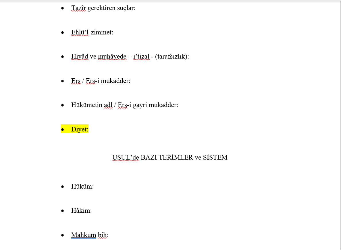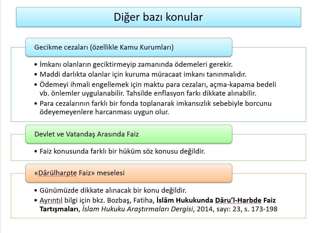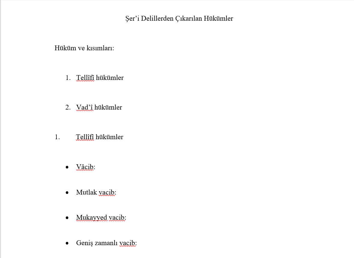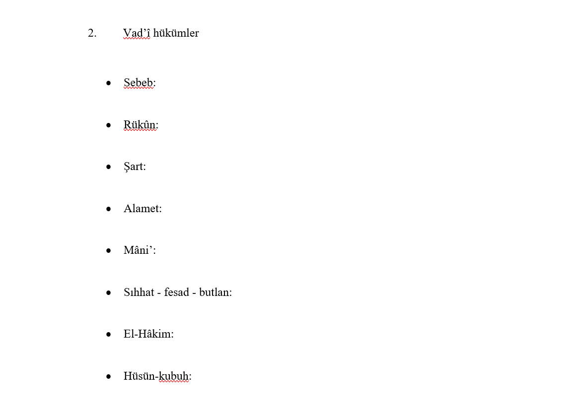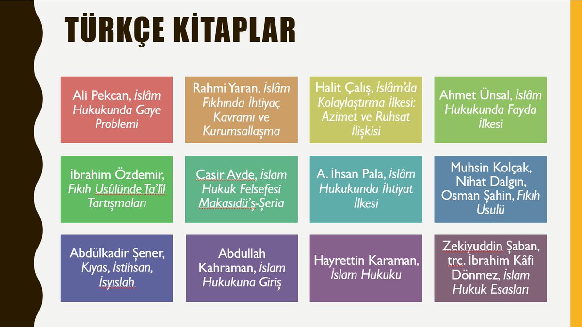 (Özellikle "Vacip" maddesini İ. Kafi Dönmez hocamızın maddede ve kitabında belirttiği gibi tablolu çalışmak pek mühim. Muhayee kavramı hukukla mukayeseli çalışılmalı)