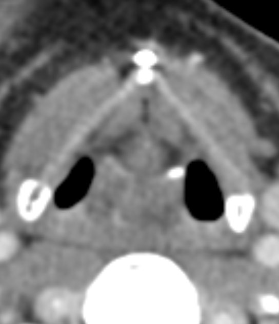 🔷Finding the true cords: Look for MUSCLE density and NO paraglottic fat at the level of the CRICOARYTENOID JOINT