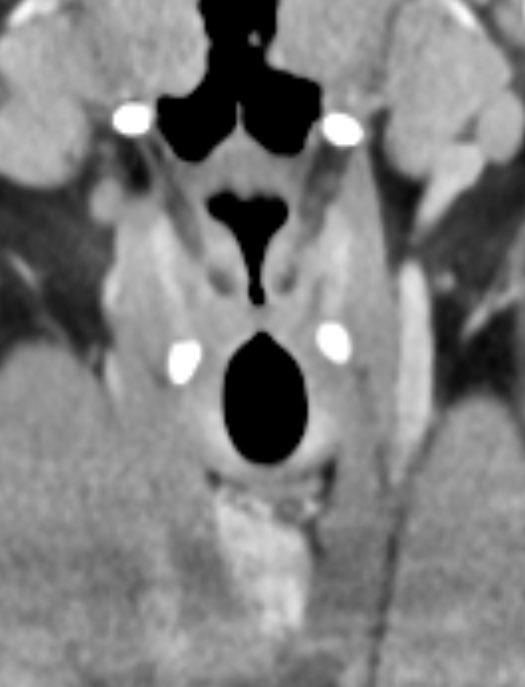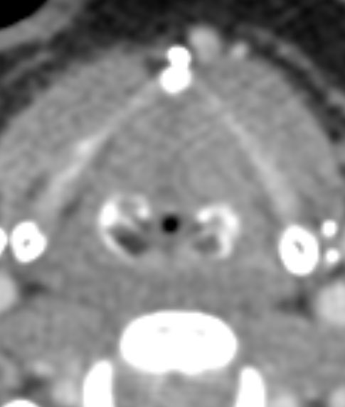 🔷Finding the false cords: Since the false cords have an attachment to the top of the arytenoid cartilage and are surrounded by paraglottic FAT we look for the TOP of the ARYTENOID cartilage and FAT in the same plane